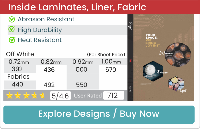 Q: What is the difference between inside laminate and outside laminate? A: “Outside” laminate is the decorative, high-quality sheet used on visible surfaces like cabinet doors, tabletops, and wardrobes. “Inside” or “Liner” laminate is a more economical sheet, often in a simple color like off-white, used for the interior of cabinets and drawers.